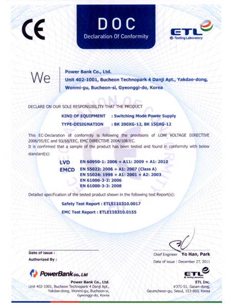 K00015, K61547, EN 55022, EN 55024, EN 61000-3-2, EN 61000-3-3 |